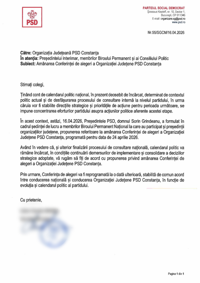 Alegerile pentru conducerea Organizației Județene a PSD Constanța, programate pentru 24 aprilie 2026, au fost amânate, NU anulate. Amânarea Conferinței de Alegeri a fost solicitată de conducerea centrală, motivul invocat fiind acela că social-democrații au acum o altă prioritate: decizia în legătură cu ieșirea sau nu de la guvernare. Pe data de 20 aprilie se […]